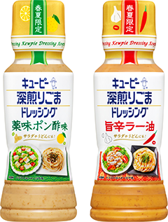深煎りごまドレッシングは、2000年に発売し、2002年以降、23年連続でドレッシング単品国内購買シェア1位※1のロングセラー商品です。深煎りごまドレッシングの春夏限定品「薬味ポン酢味」と「旨辛ラー油」は、多くの“深ごま”ユーザーが他の調味料と組み合わせてアレンジを楽しんでいることをヒントに、昨年2月に発売しました※2。