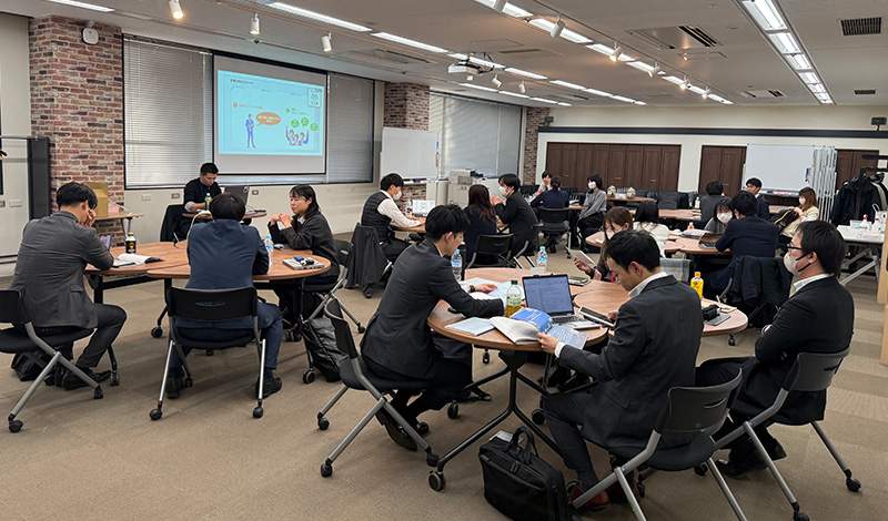 入社年の4月の春と正社員となるタイミングである入社半年後の秋に合同研修を実施しています。会社の理念や仕事の進め方、ビジネスマナーなどを学び、社会人としての一歩をサポートし主体的に行動できるスキルを学んでいただきます。